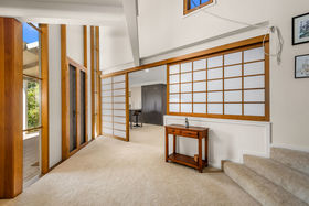 The northern wing reveals a stunning, light-filled living space featuring edgy mud brick walls and a freestanding fireplace"an incredibly versatile room ideal as a sophisticated lounge, home office, or an inviting entertaining zone with double doors wide enough to accommodate a pool table or even a grand piano. Timber screens add a refined architectural touch, subtly defining multiple living areas while maintaining a sense of openness and flow.